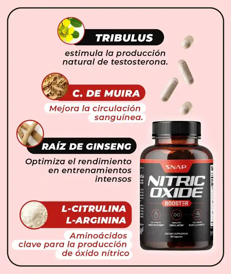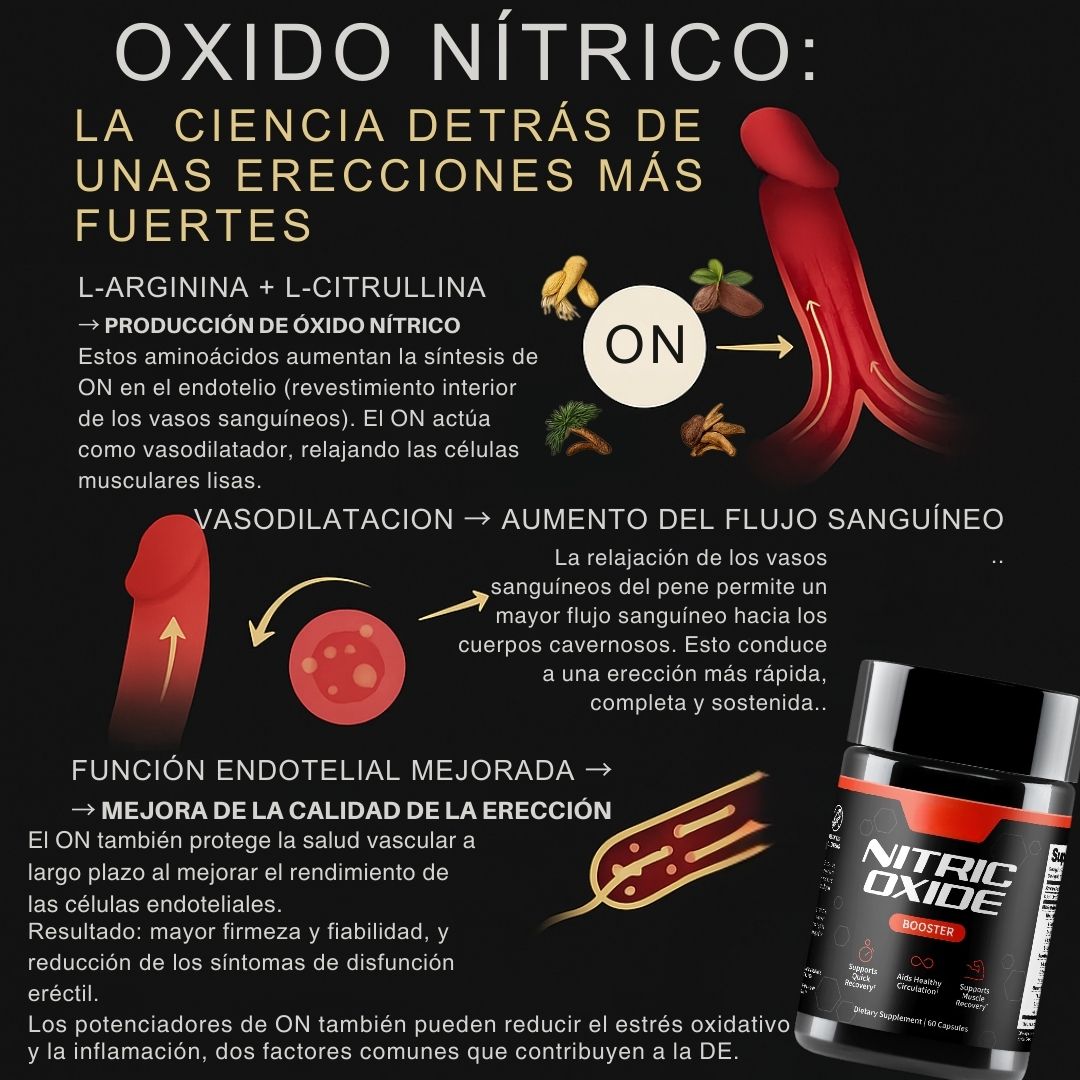 Si sientes que el cansancio te gana la batalla o que la inseguridad te impide disfrutar al máximo, el Oxido Nítrico es tu aliado secreto. Su fórmula con L-Citrulina y otros potenciadores naturales está diseñada para aumentar el flujo sanguíneo y tu resistencia, dándote esa firmeza, energía y duración que buscas.