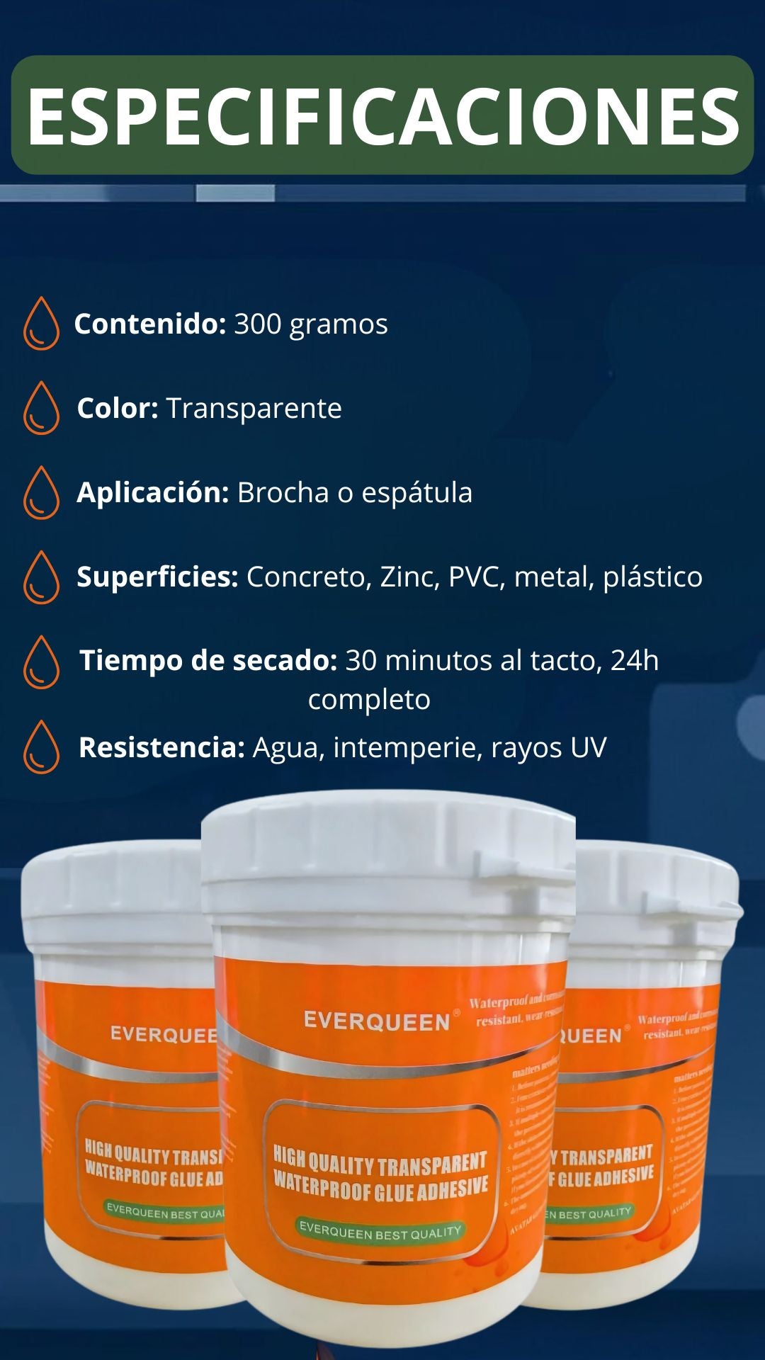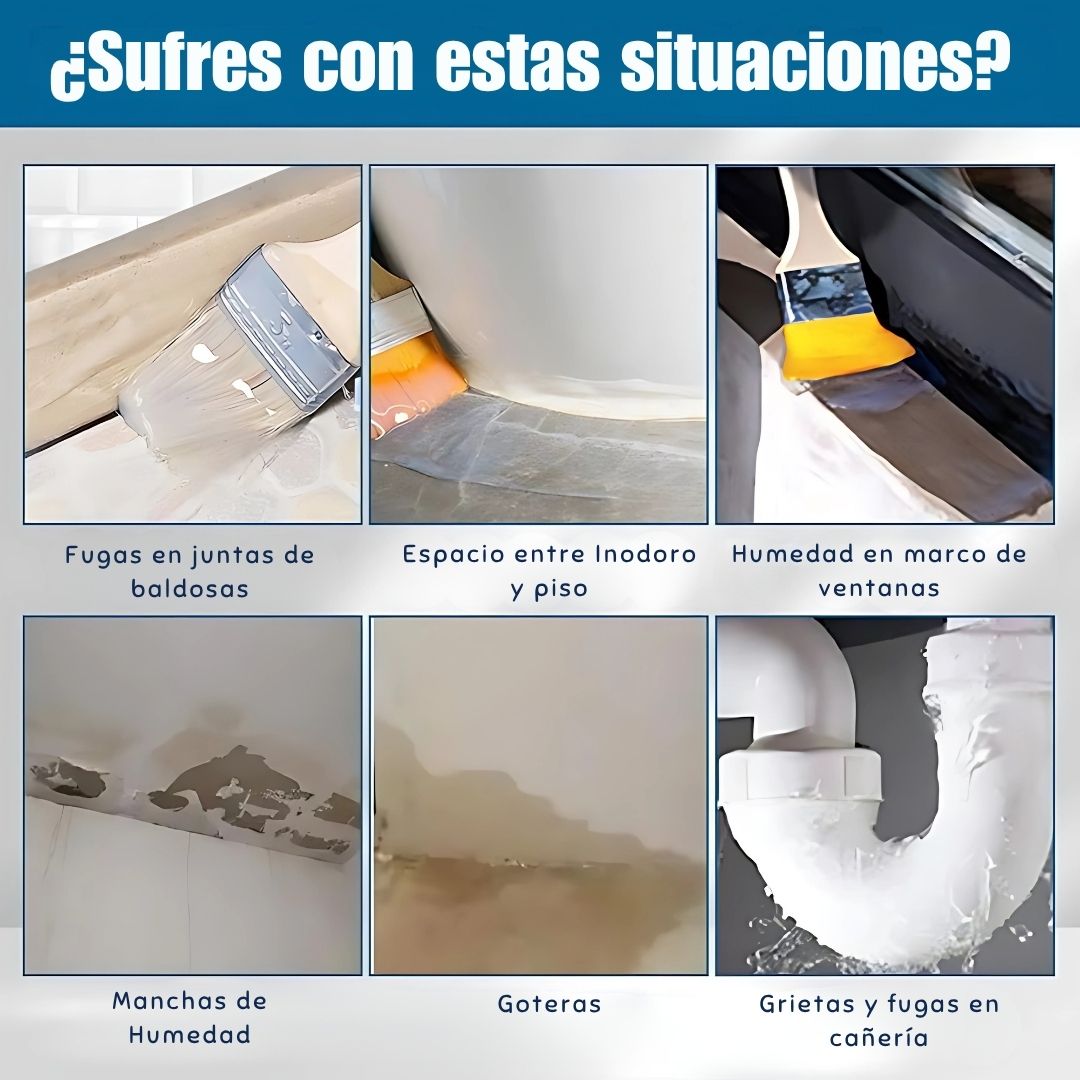 Sella filtraciones, goteras y grietas al instante con una capa impermeable transparente que protege contra el agua, humedad y desgaste.